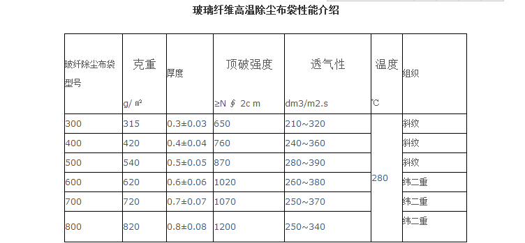 玻纤高温除尘布袋/玻璃纤维滤袋是使用玻璃纤维机织物经特殊表面处理制成的过滤材料,具有耐高温、耐腐蚀、抗结露、热稳定性好、粉尘剥离性好、清灰能耗低等特点,玻璃纤维除尘布袋伸长不变形,尺寸稳定好,是一种较为理想的除尘布袋,可在280℃的温度下长期使用。玻纤除尘布袋广泛应用于:钢铁、治炼、铁合金、化工、水泥、电石、垃圾焚烧、电力、沥青搅抖等。